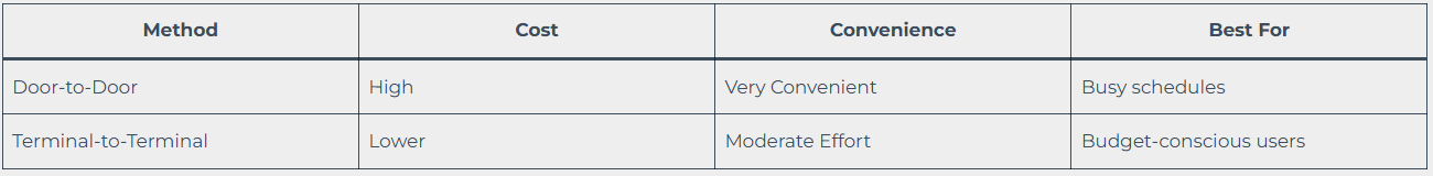 Door-to-door is ideal for those prioritizing convenience, while terminal services are a budget-friendly choice.